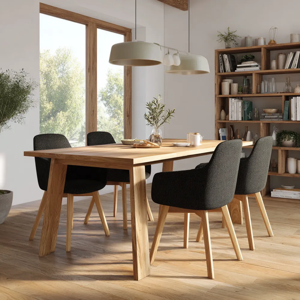 Esszimmer-Set Massivholz Tisch 160x90x75 cm mit 4 Polsterstühlen - Schwarz/Holz - Skandinavisches Design