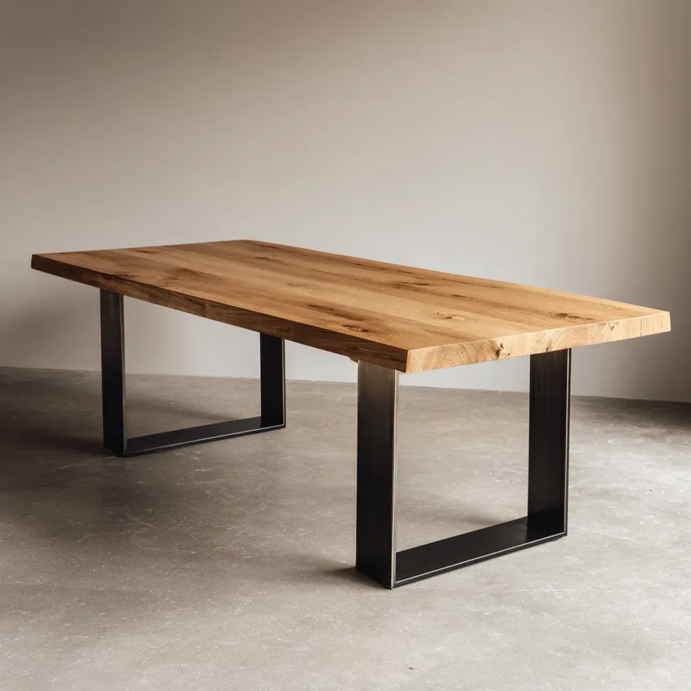 Material und VerarbeitungDer Tisch besteht aus hochwertigem Eichenholz in natürlicher Farbe mit einer robusten Oberfläche und einem stabilen Metallgestell in Schwarz.