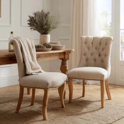 ProduktbeschreibungDieser Esszimmerstuhl im Landhausstil bringt zeitlose Eleganz in Ihr Esszimmer. Mit seinem weichen Leinenbezug und stabilen Holzbeinen passt er perfekt in verschiedene Einrichtungen.